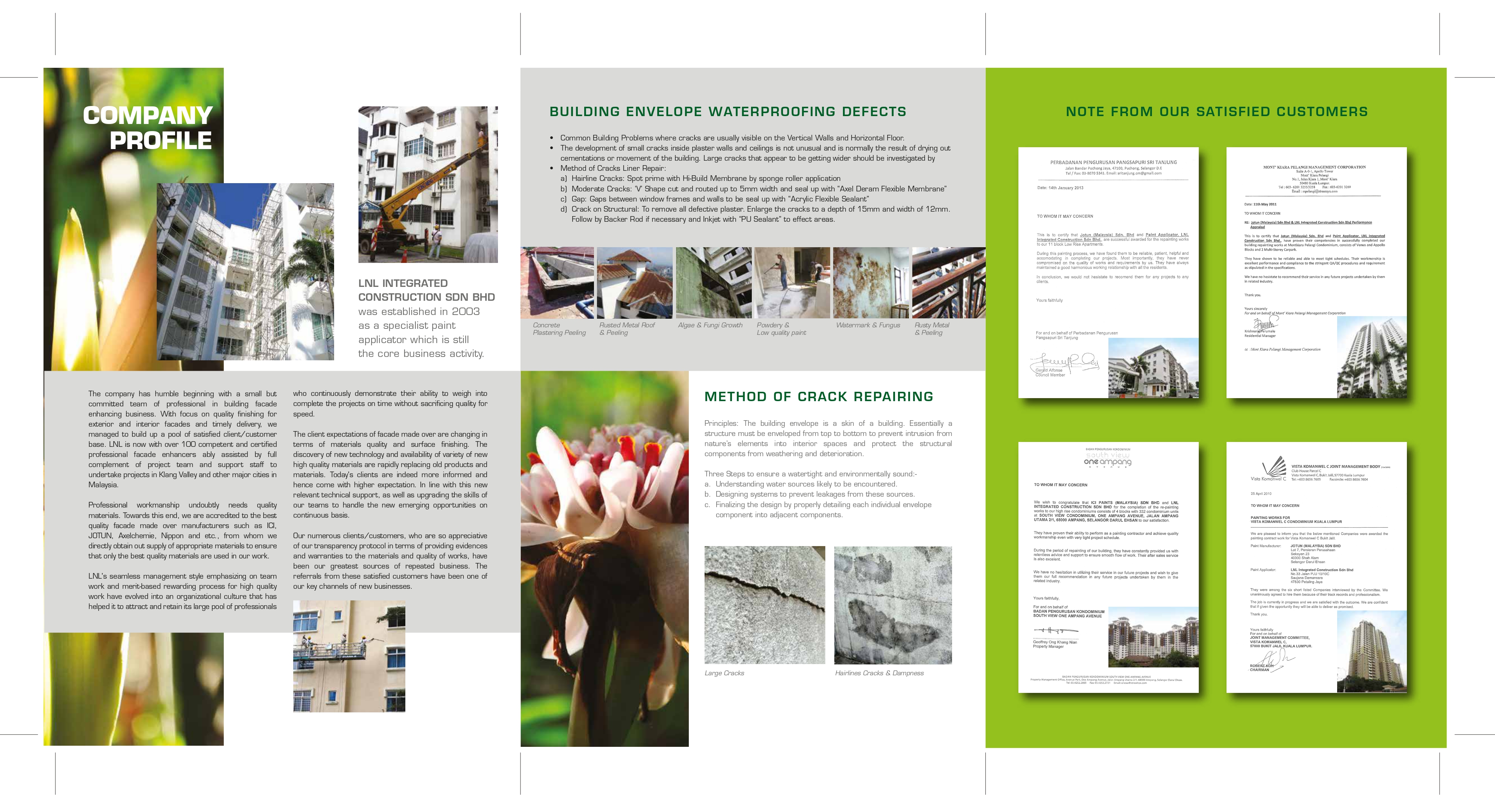LNL is now with over 100 competent and certified professional facade enhancers ably assisted by full complement of project team and support staff to undertake projects in Klang Valley and other major cities in Malaysia. We are accredited to the best quality facade made over manufacturers such as ICI, JOTUN, etc., from whom we directly obtain out supply of appropriate materials.